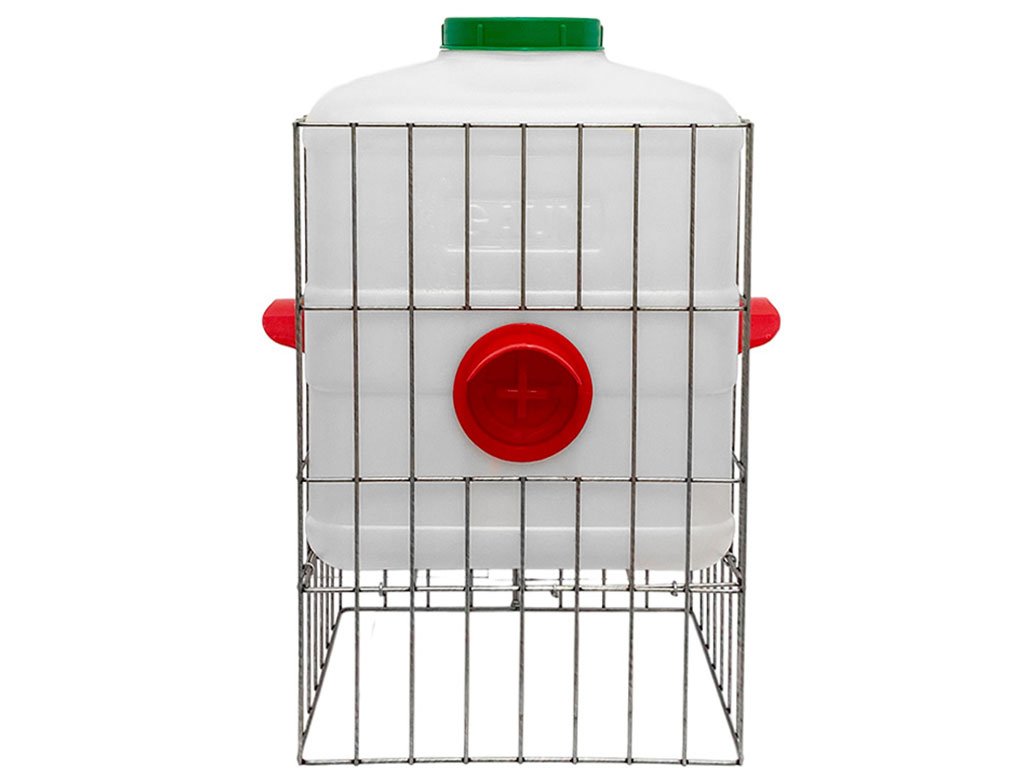 Barelové krmítko, pro slepice a drůbež, s 20 l zásobníkem, 3 krmící otvory, s ochrannou mřížkou barelu, možnost zavěšení, rozměry 350x280x470 mm.