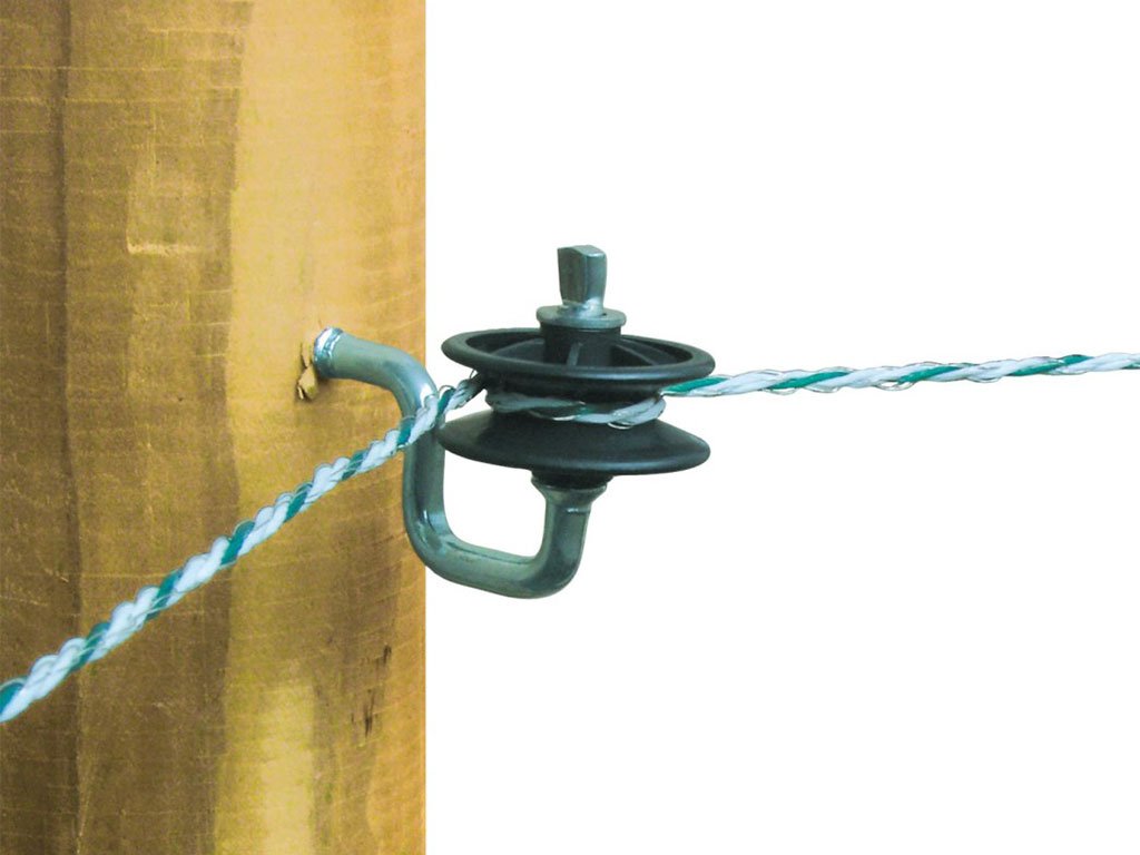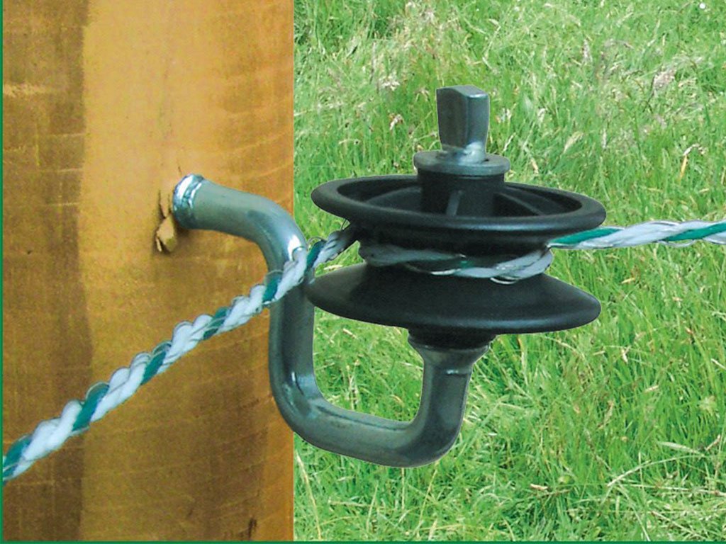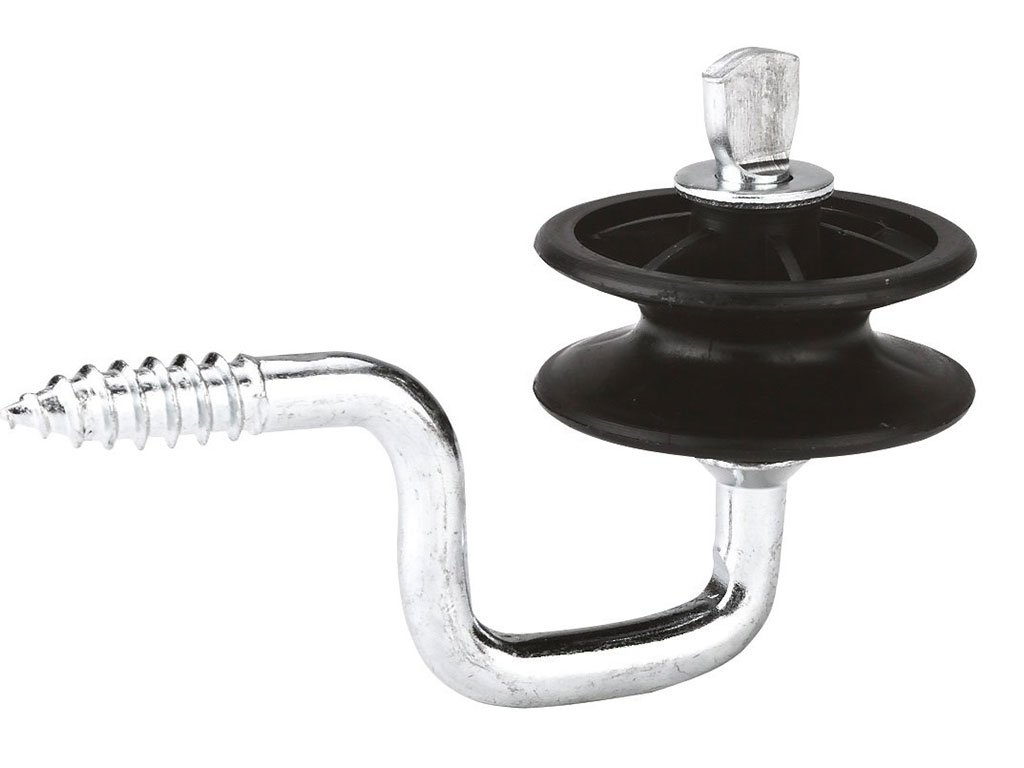 Rohový izolátor, pro elektrický ohradník, pro drát, lanko nebo pásku, plně otočný válec, s pozinkovaným vrutem, průměr 7 mm.