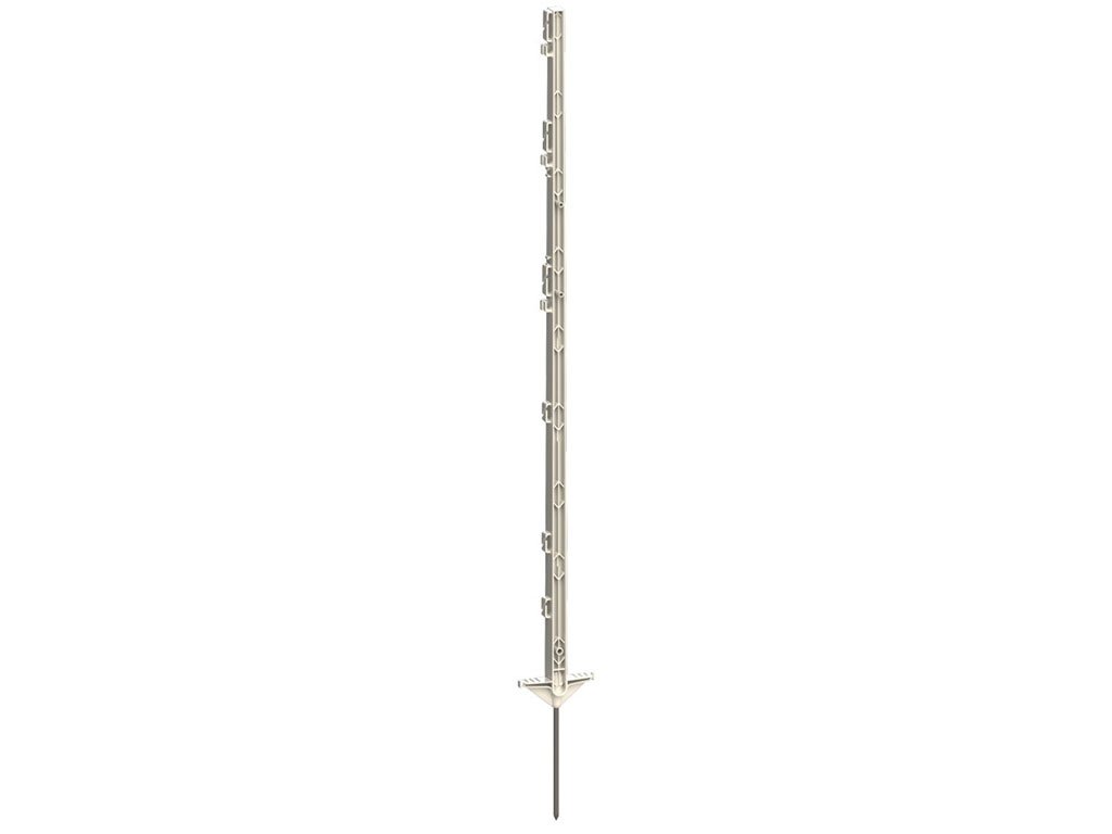 Plastový sloupek, pro elektrický ohradník, vysoce kvalitní plast, vysoká odolnost, využití pro dráty, pásky, lanka, dvojitý nášlap, pozinkovaný hrot, délka hrotu 21 cm, celková délka 125 cm.
