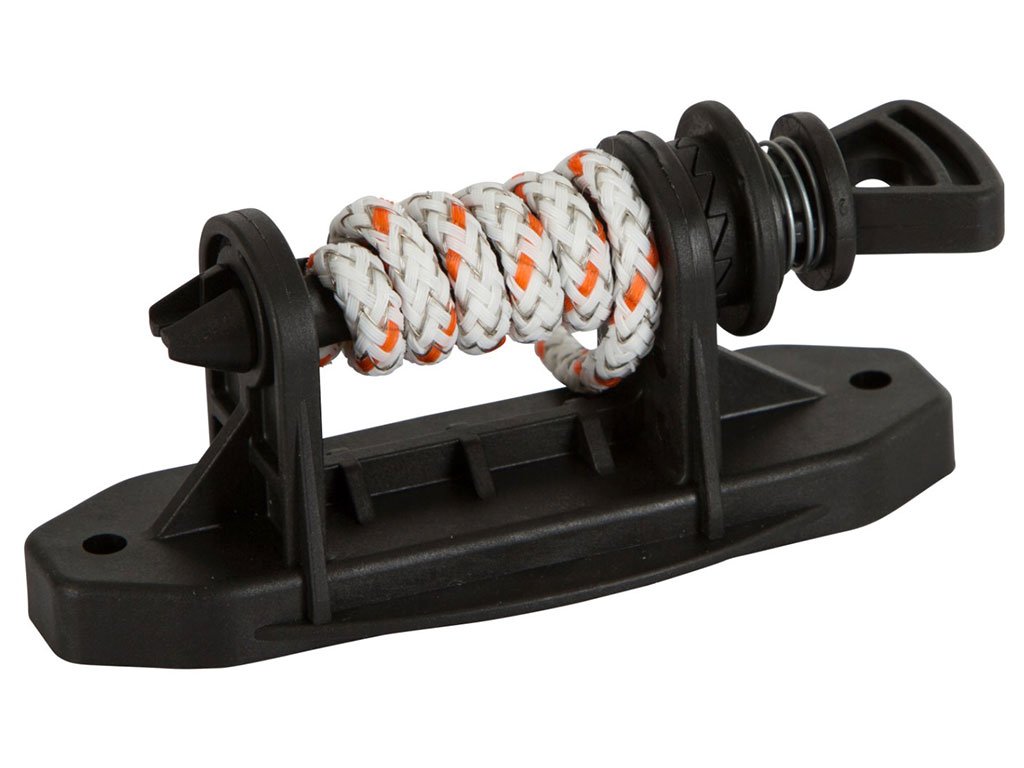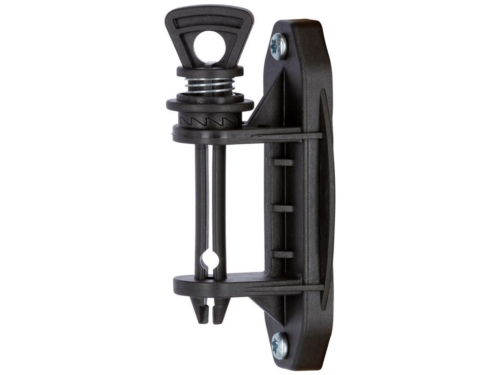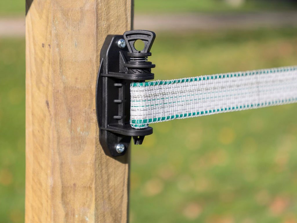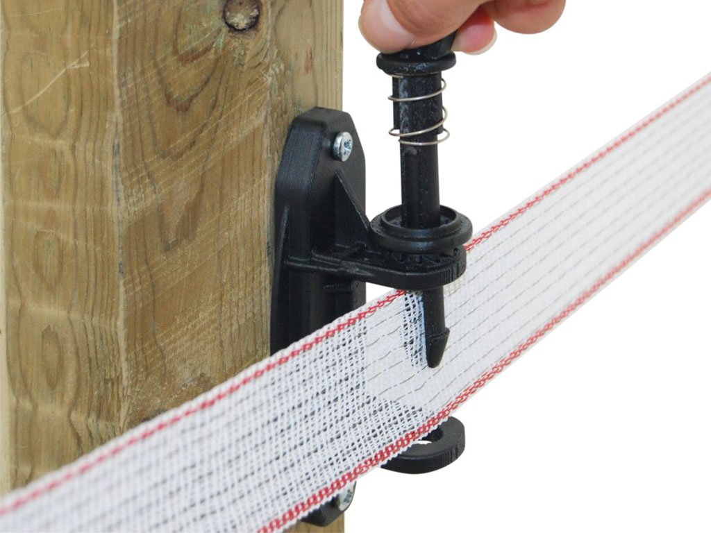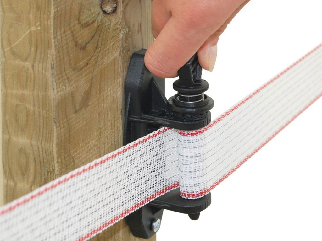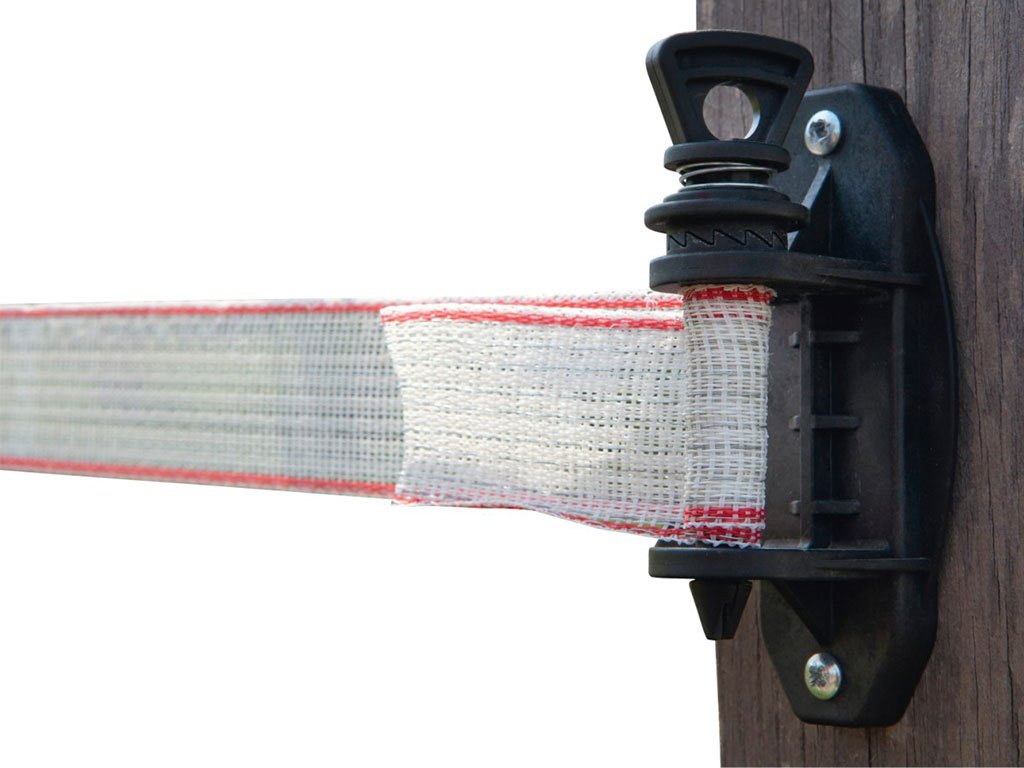 Napínací izolátor pro elektrický ohradník, vhodný pro pásky a lanka, z velmi odolného materiálu, vyztužený skleněnými vlákny, jednoduché ruční napínání, pro pásky do 40 mm, pro lanka do Ø 8mm, montáž na 2 vruty.