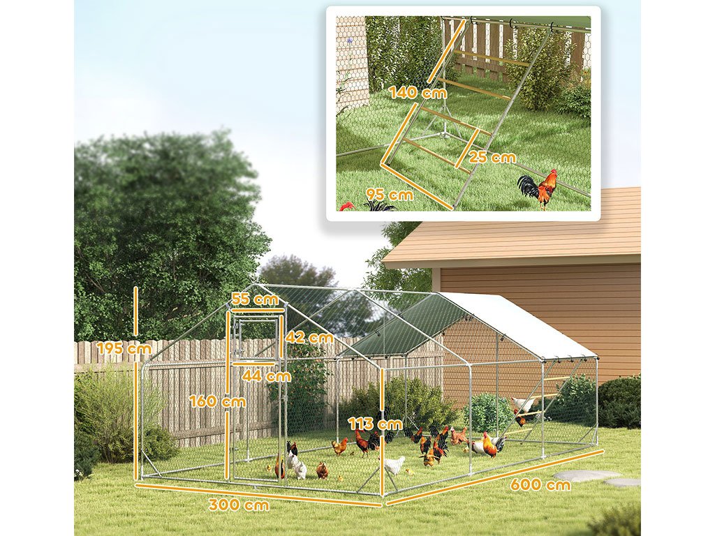 Výběh pro drůbež pozinkovaný, vhodný pro 18-24 slepic, prostorný o rozloze 18 m2, odolné šestihranné pletivo, ochranná plachta před UV zářením a deštěm, praktická krmná dvířka, závěsný krmný řetěz a víceúrovňové bidlo, velká vstupní branka, celkové rozměry 300x600x195 cm.
