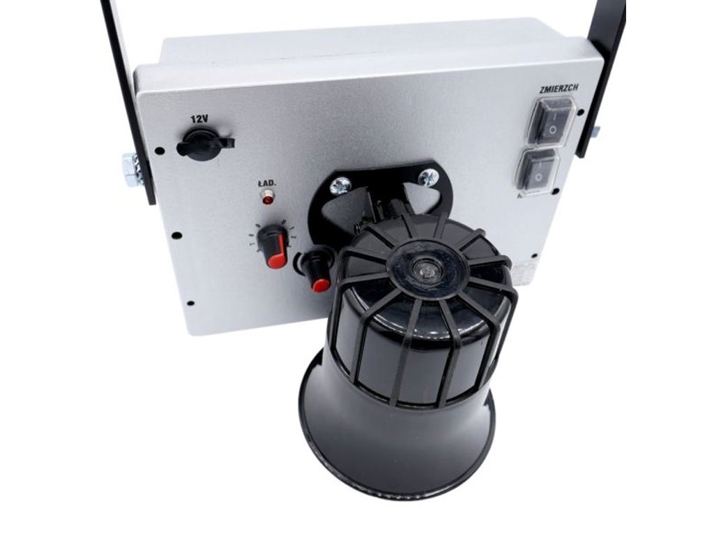Zvukový odpuzovač divoké zvěře, napájení 230 V nebo 12 V baterie, chrání plochu až 7000 m2, reprodukuje velmi hlasité zvuky, vestavěný výkonový zesilovač, radarový senzor pohybu, s ochranou IP44, soumrakový režim, dálkové ovládání zařízení, různé režimy provozu, rozměry 22,5x16 cm.
